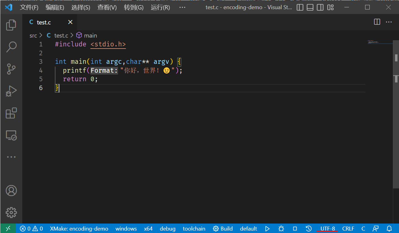 首先看一个简单的示例,下面是一段简单的 c 语言 hello world