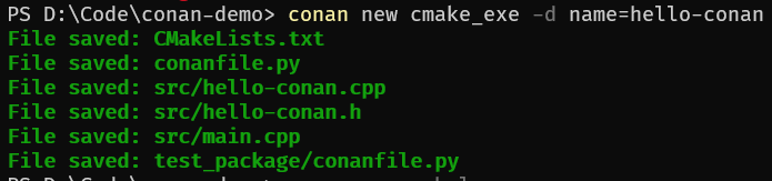 1 | conan new cmake_exe -d name=hello-conan |