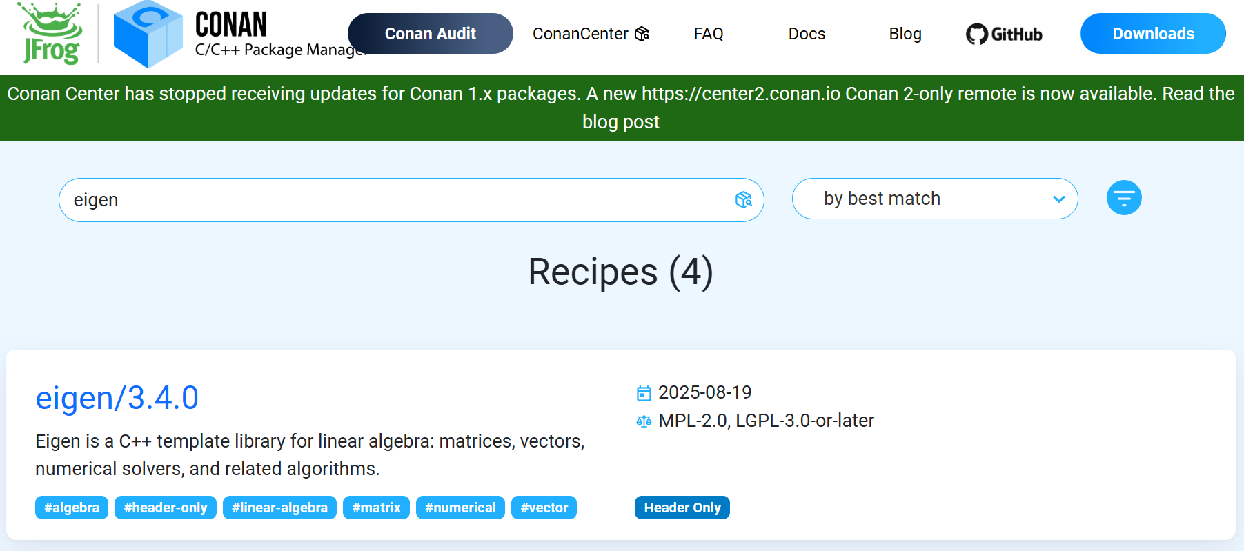 首先在 conan center 网站上查询需要使用包的版本