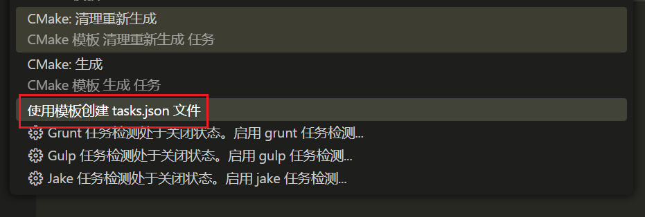 然后点击 "使用模板创建 tasks.json 文件" ,这样就会自动创建一个可用的 tasks.json
