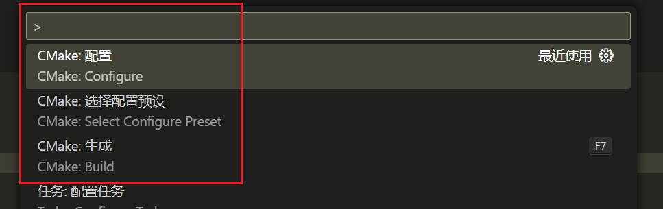 在 VS Code 中已经集成了 CMake 的插件,可以直接读取 Conan 生成好的 CMakePresets.json 进行配置和编译,那么我们只需要在 Tasks 中编写 Conan 的相关操作即可。对于 CMake 相关操作直接通过 Ctrl+Shift+P 调出命令面板执行即可,如下图所示: