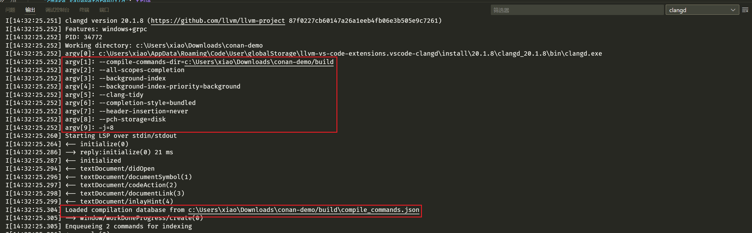 并在输出中观察 clangd 是否正常工作