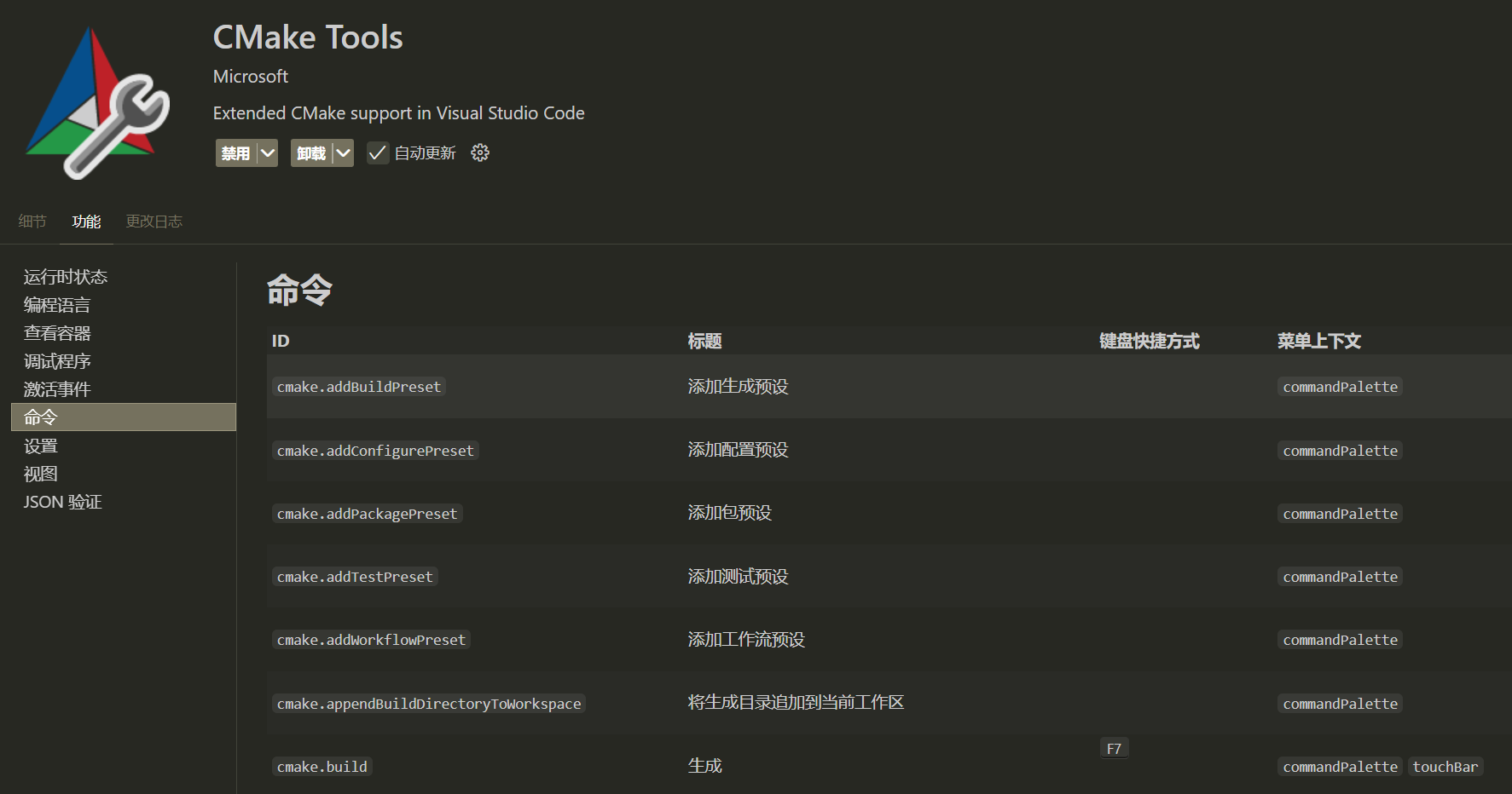 如果需要使用其他命令,可以在插件的详情面板查询插件提供的所有命令(不过当我们需要指定额外的运行参数时,还是直接创建新的 launch target 比较好)