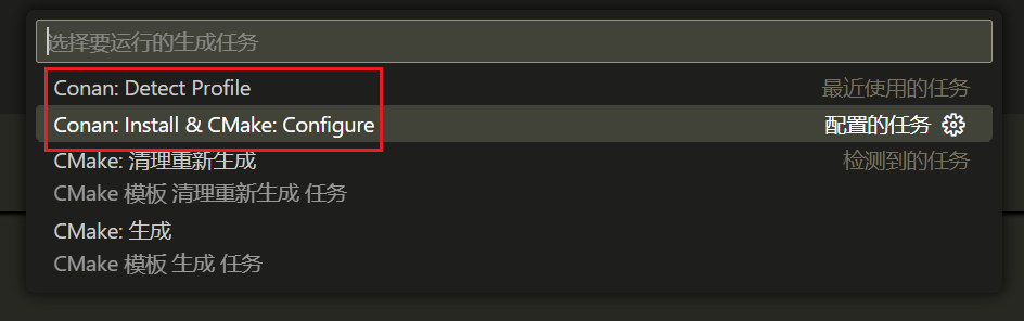 Conan: Detect Profile:对应conan profile detect --forceConan: Install Dependency [Debug]:对应conan install(安装 Debug 编译模式下的依赖)Conan: Install Dependency [Release]:对应conan install(安装 Release 编译模式下的依赖)CMake: Select Configure Preset:通过${command:cmake.selectConfigurePreset}执行 CMake 插件提供的命令CMake: Configure:同上,通过${command:cmake.configure}执行 CMake 插件提供的命令Note这里