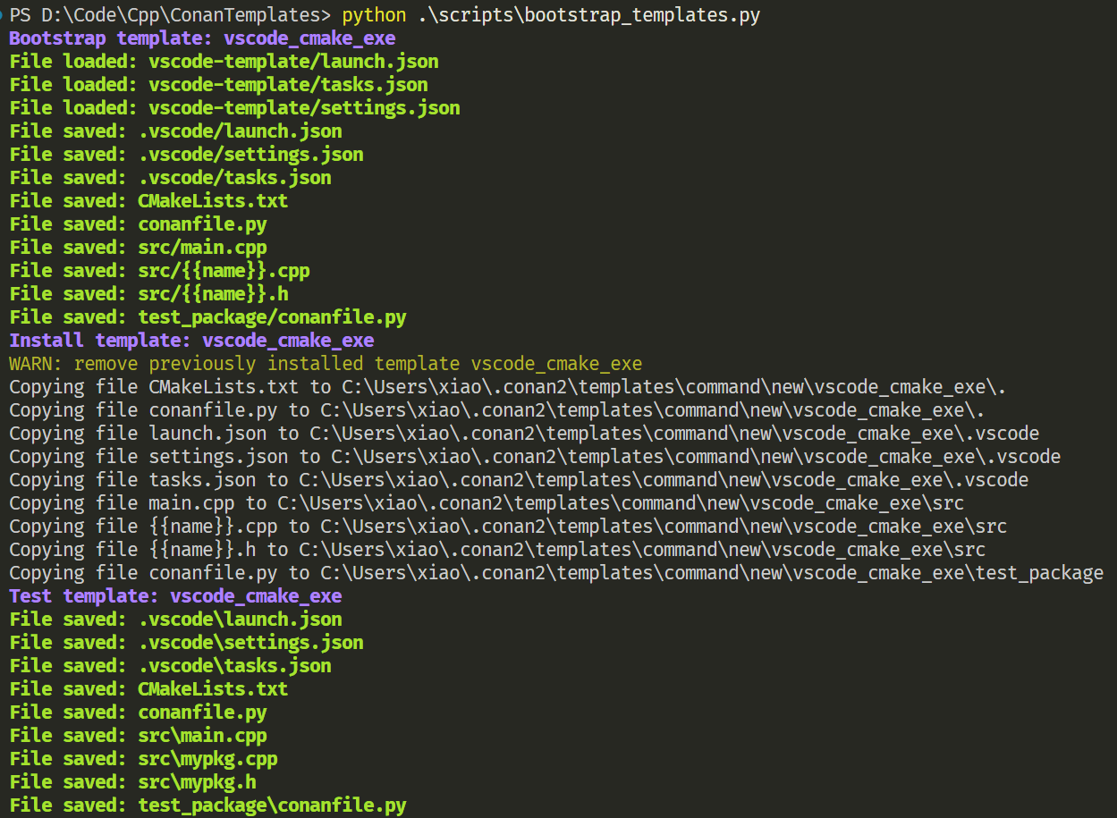 个人也整理了一个自用的 VS Code CMake Conan 模板,并基于 Conan API 实现自动安装到 Conan 的模版路径。