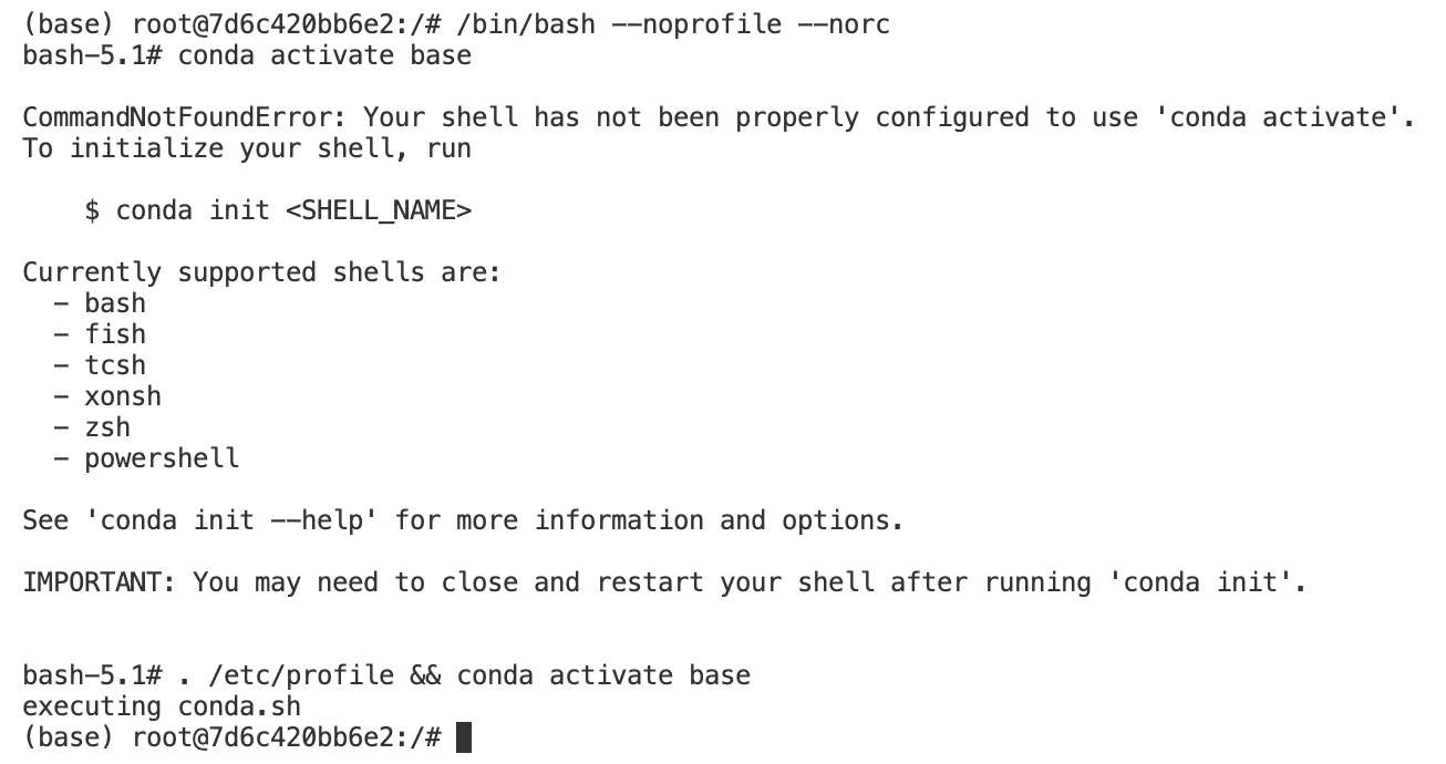 1 2 3 4 5 6 7 8 FROM continuumio/miniconda3:23.3 .1 -0 COPY .condarc /root/.condarc SHELL [ "/bin/bash" ,"--login" ,"-c" ] RUN conda create -n test python=3.9 -y && \ conda activate test && \ conda install numpy -y && \ echo 'conda activate test' >> ~/.bashrc CMD ["/bin/bash" ]