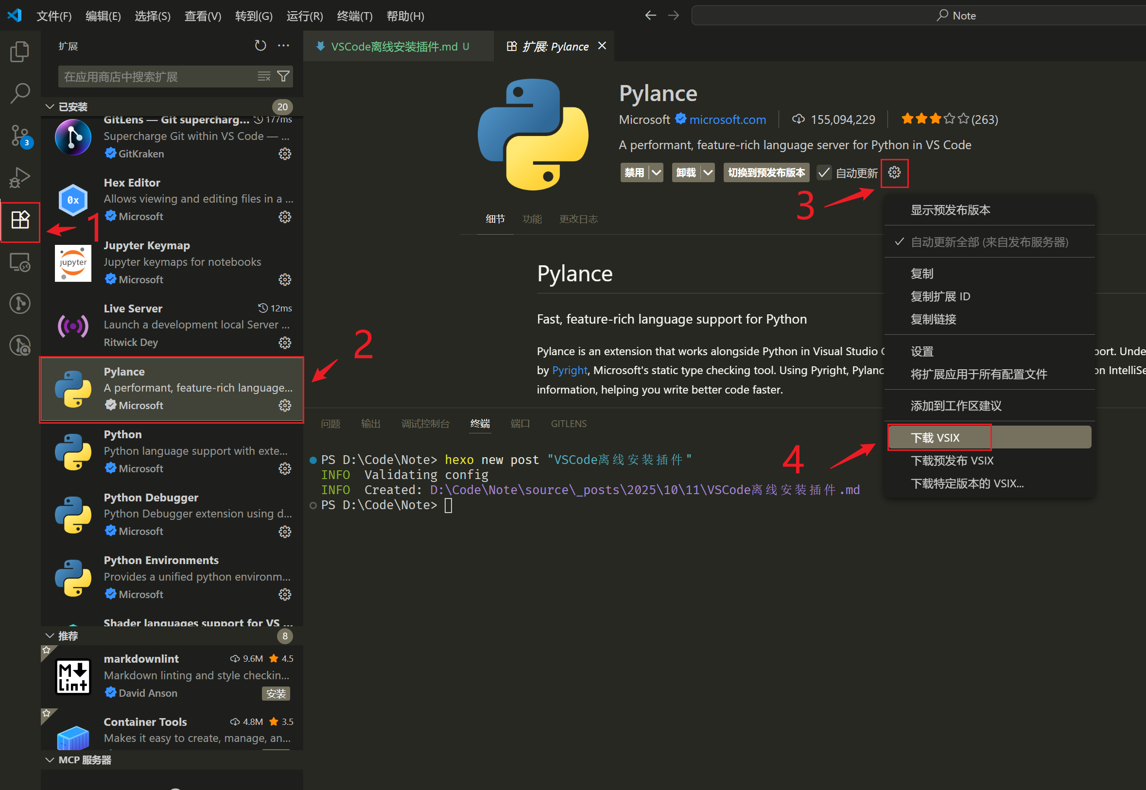 以 Pylance 为例,在 github 上并没有对应的 vsix 包可以下载,只能在 VS Code 中下载,操作如下