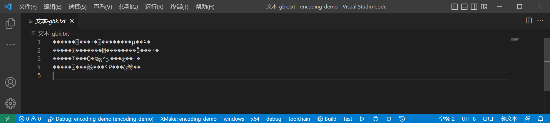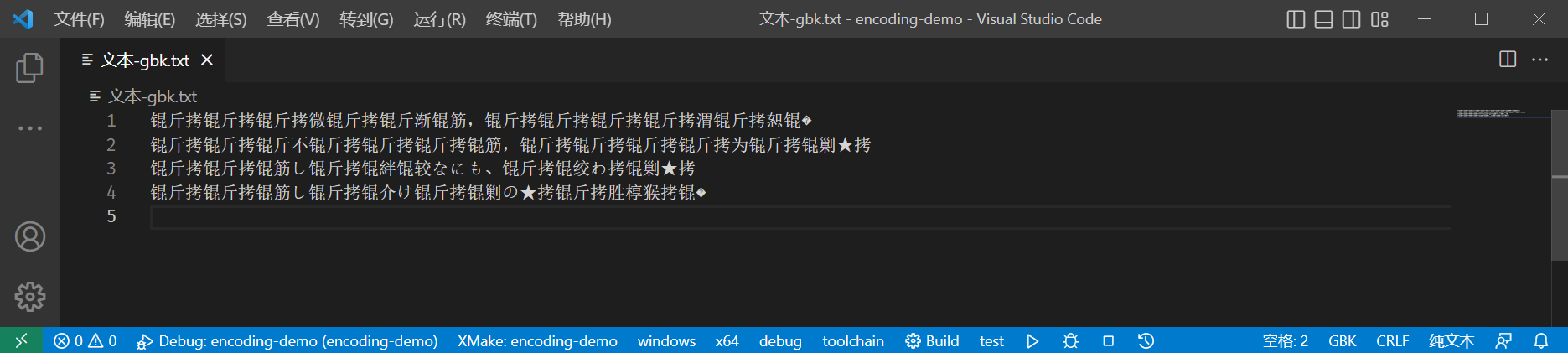 我们原本的文件是 GBK 编码的,我们将窗口关闭,再打开。由于 VS Code 并不知道文件的编码,便默认使用 UTF-8 编码打开,内容如下: